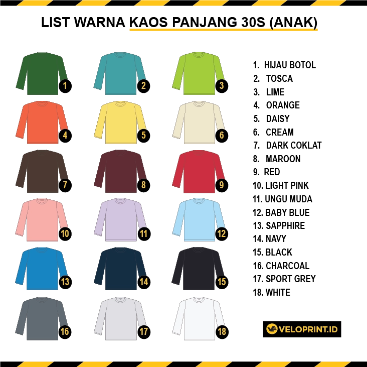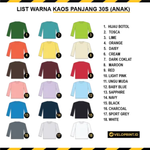 Kaos anak lengan panjang combed 30s ini dirancang untuk memberikan kenyamanan optimal dengan menggunakan bahan katun berkualitas tinggi. Tekstur kainnya yang halus dan ringan membuat kaos ini nyaman dikenakan sepanjang hari, baik untuk aktivitas santai maupun aktif. Tersedia dalam berbagai pilihan warna, kaos ini menawarkan fleksibilitas dalam gaya. Selain itu, Anda juga bisa melakukan custom sesuai keinginan, menjadikannya pilihan sempurna untuk menciptakan tampilan unik yang sesuai dengan personalisasi dan selera Anda. Tetap nyaman dan stylish dengan kaos ini di setiap kesempatan